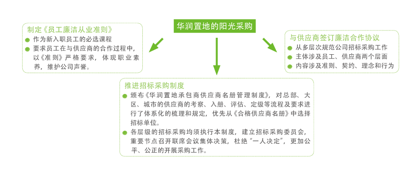 華潤(rùn)集團(tuán)多年來廣泛開展“陽光宣言”活動(dòng),明確要求下屬各單位在與第三方開展經(jīng)濟(jì)合作時(shí)簽定廉潔協(xié)議書,并向華潤(rùn)所有的供應(yīng)商、合作伙伴聲明不得通過不正當(dāng)?shù)氖侄闻c華潤(rùn)的企業(yè)開展合作。在采購(gòu)產(chǎn)品和服務(wù)等過程中,嚴(yán)格遵循公開透明原則,規(guī)范招標(biāo)、陽光采購(gòu),集團(tuán)在官網(wǎng)開設(shè)了“商務(wù)服務(wù)-陽光采購(gòu)”平臺(tái),華潤(rùn)電力、華潤(rùn)煤業(yè)、華潤(rùn)置地、華潤(rùn)紡織等設(shè)置了供應(yīng)商門戶和集采平臺(tái),非涉密信息及整個(gè)過程在公眾監(jiān)督之下;同時(shí),華潤(rùn)電力、華潤(rùn)置地、華潤(rùn)水泥、華潤(rùn)燃?xì)狻⑷A潤(rùn)壓縮機(jī)等企業(yè)通過修訂集中采購(gòu)目錄、推行采購(gòu)崗位輪換制度、增加采購(gòu)合同中誠(chéng)信條款、設(shè)立監(jiān)督舉報(bào)郵箱和電話等措施,有效杜絕行賄受賄。